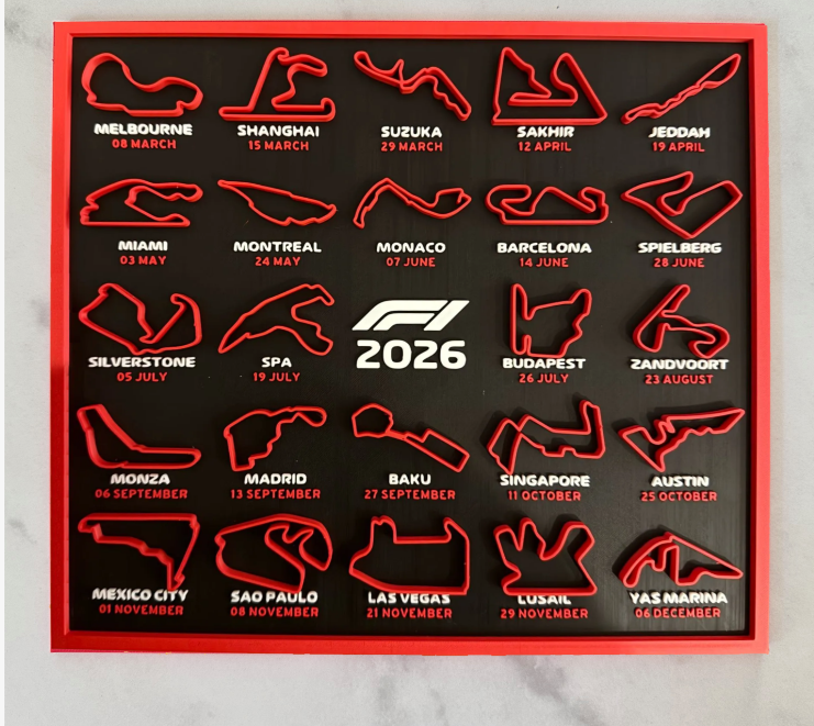 Bring the thrill of Formula 1 into your home or office with this unique 3D printed 2026 F1 calendar. Perfect for fans who want to keep track of every race in style.